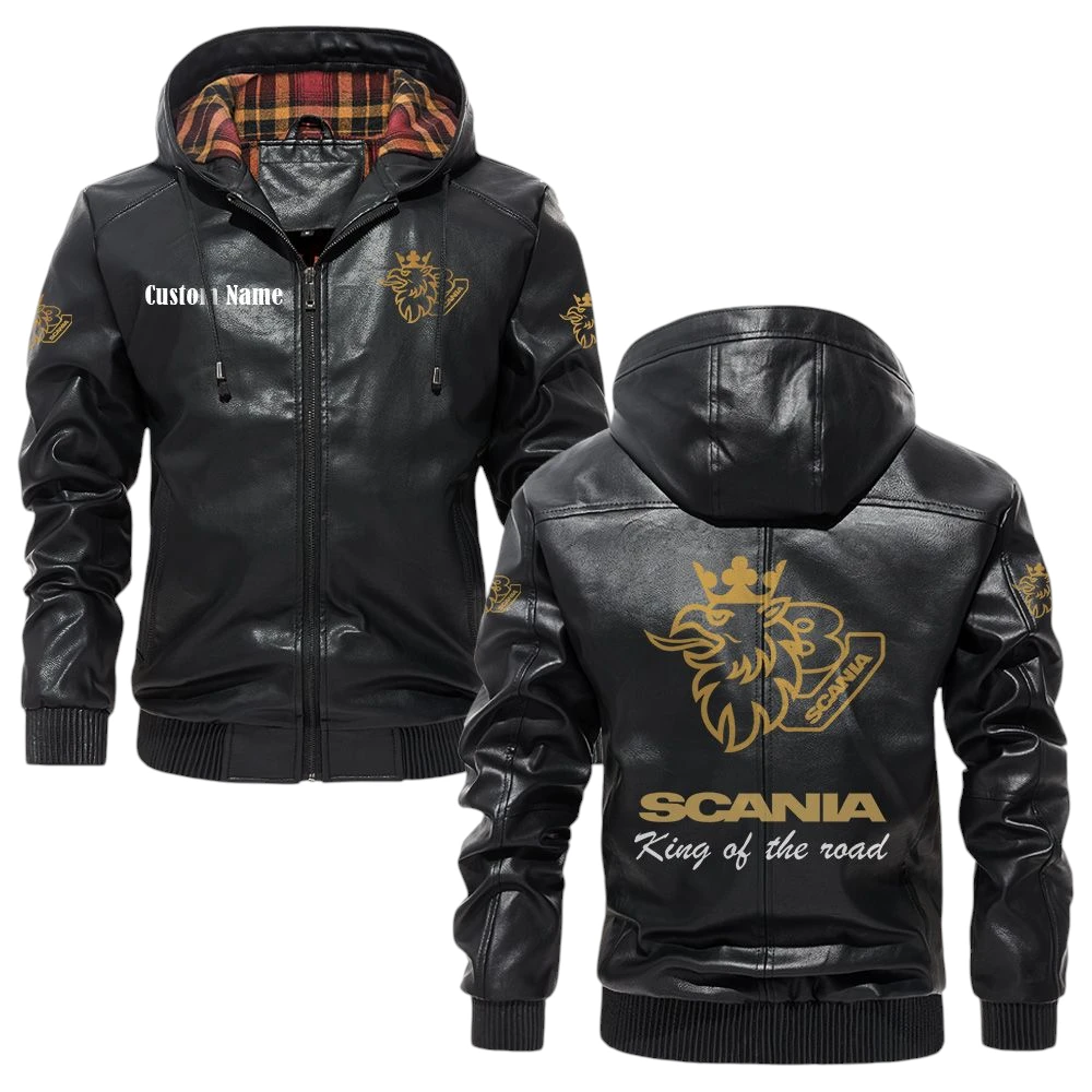 Scania V8 Exclusive Logo Hooded Jacket PU Leather x Durable Windproof Warm Soft Checkered Lining, Custom Name HG270325Y47JHLCT2SCA