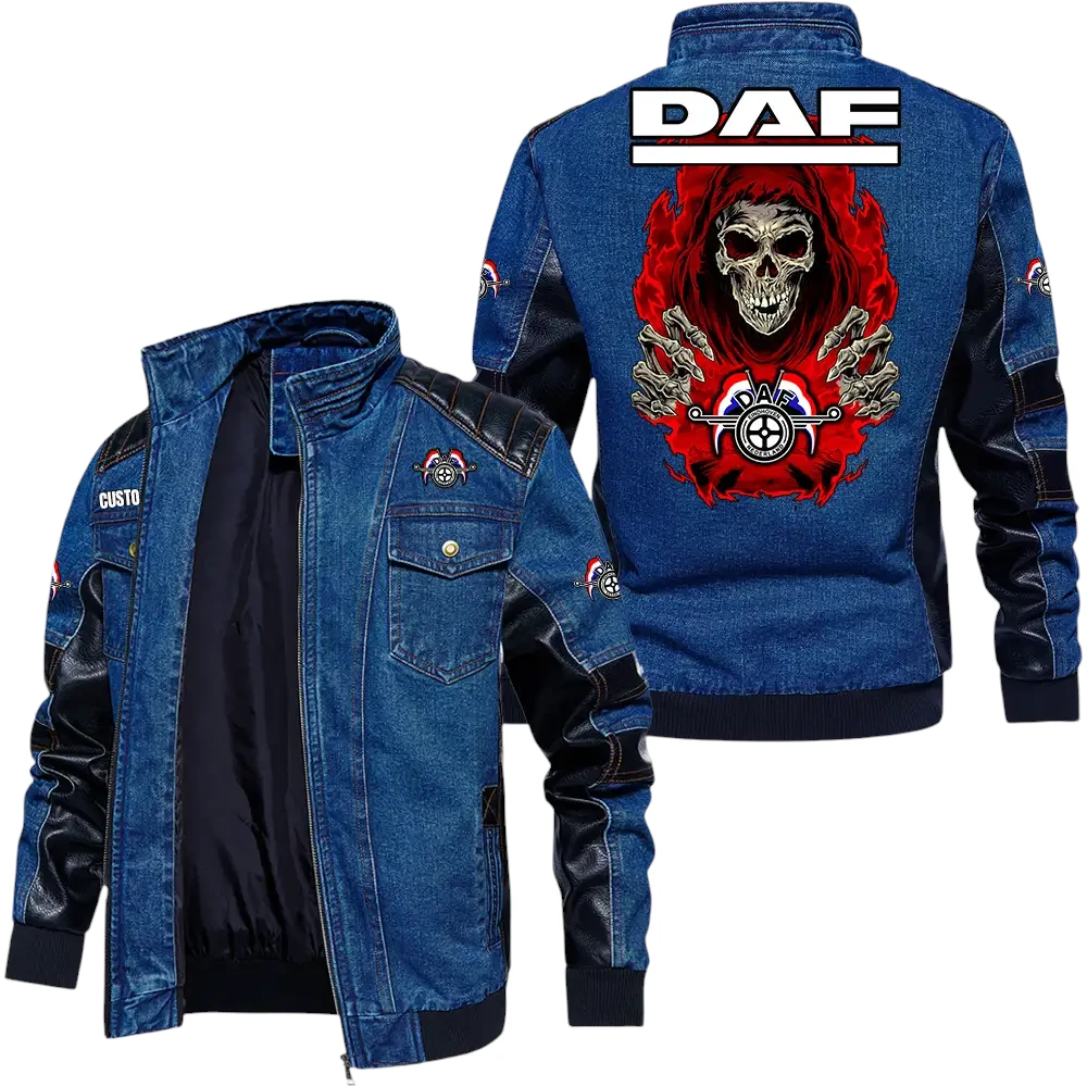 Vintage DAF Denim Jacket Sleeve PU Leather, Stand Collar Multi Pockets Custom Name TN150325Y34J91BLCT1DAF