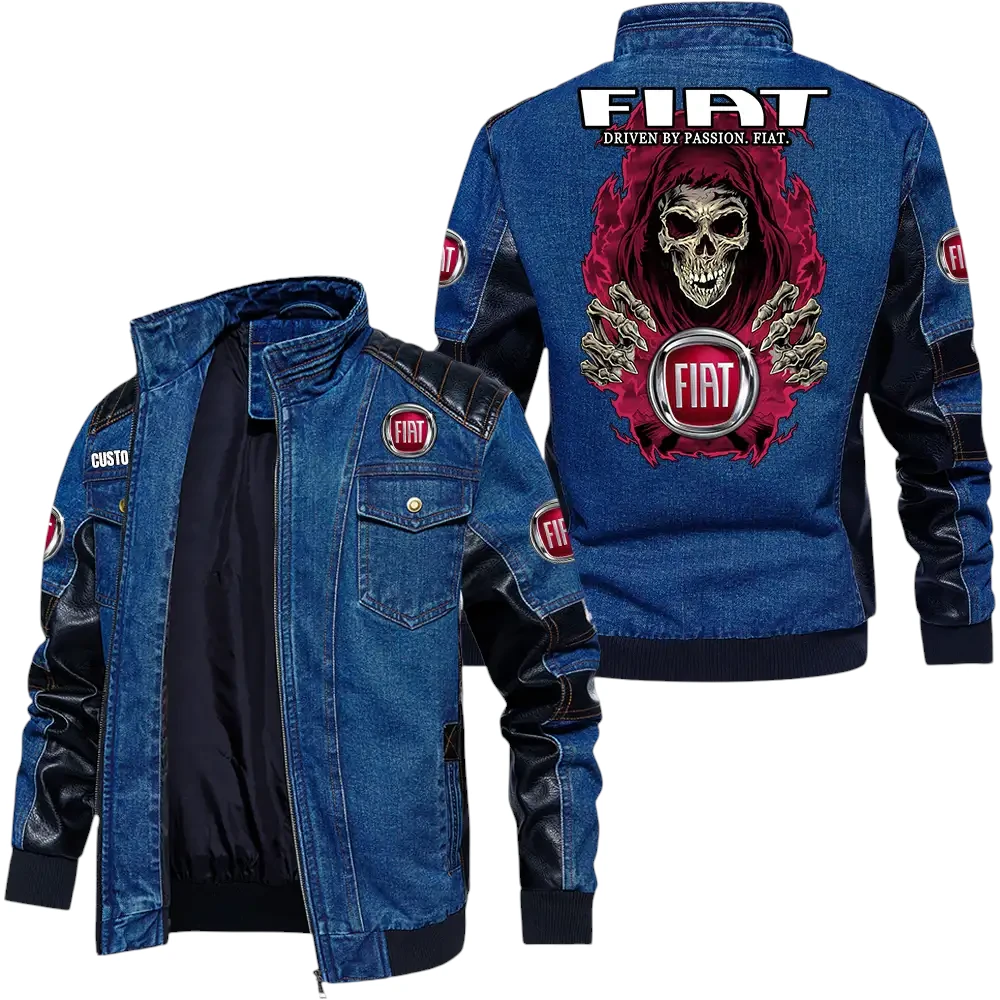 Vintage Fiat Denim Jacket Sleeve PU Leather, Stand Collar Multi Pockets Custom Name TN150325Y34J91BLCT1FIA
