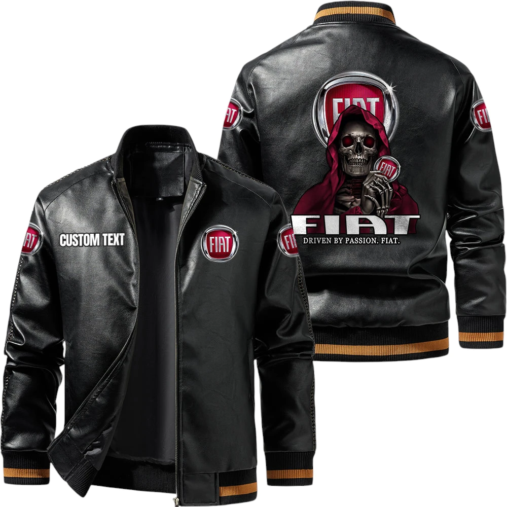 Vintage Fiat Exclusive Logo Leather Jacket, Classic Ribbed Collar Striped Cuffs, Custom Name TN160325Y12LJ93CT1FIA