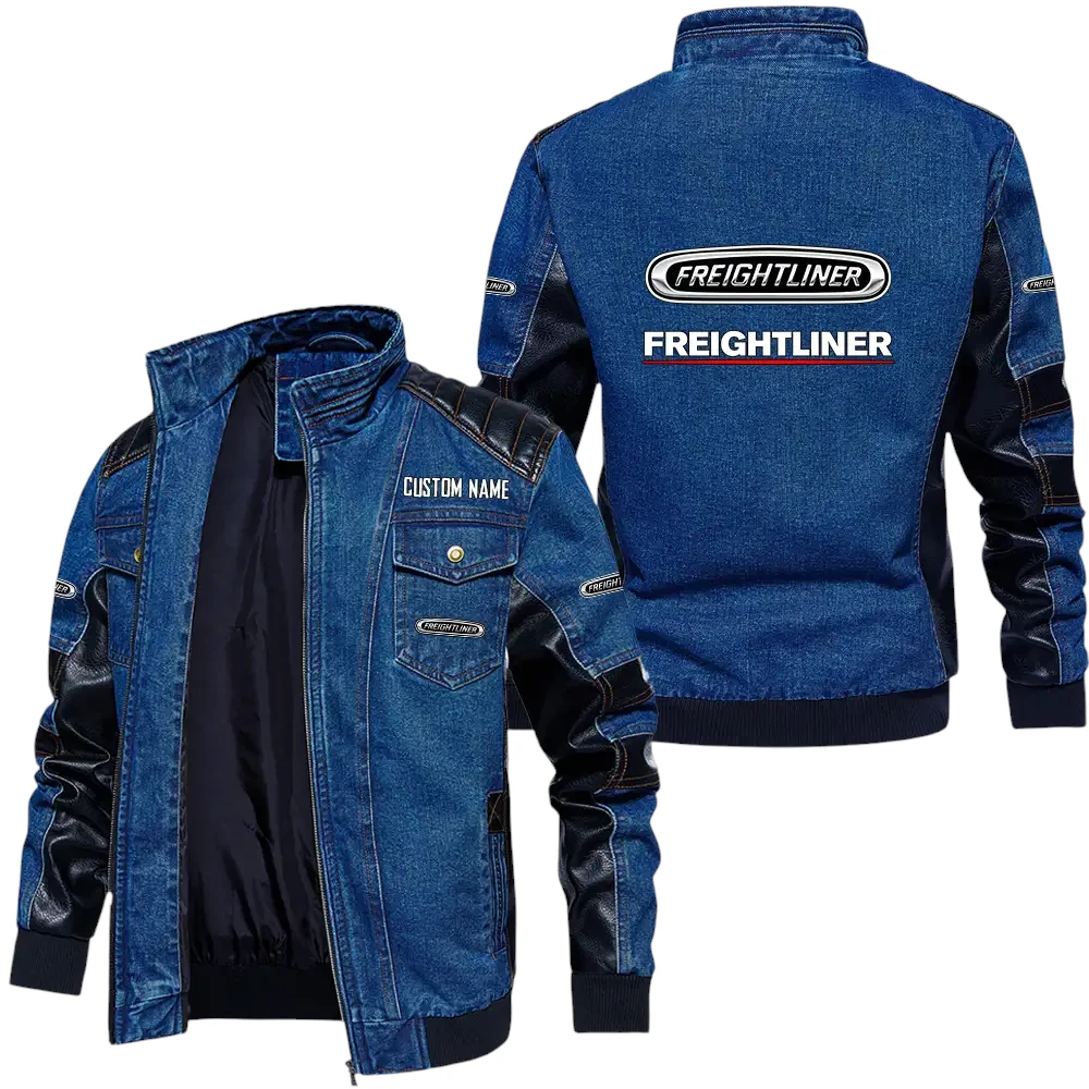 Vintage Freightliner Denim Jacket Sleeve PU Leather, Stand Collar Multi Pockets Custom Name TN140325Y34J91BLFRE