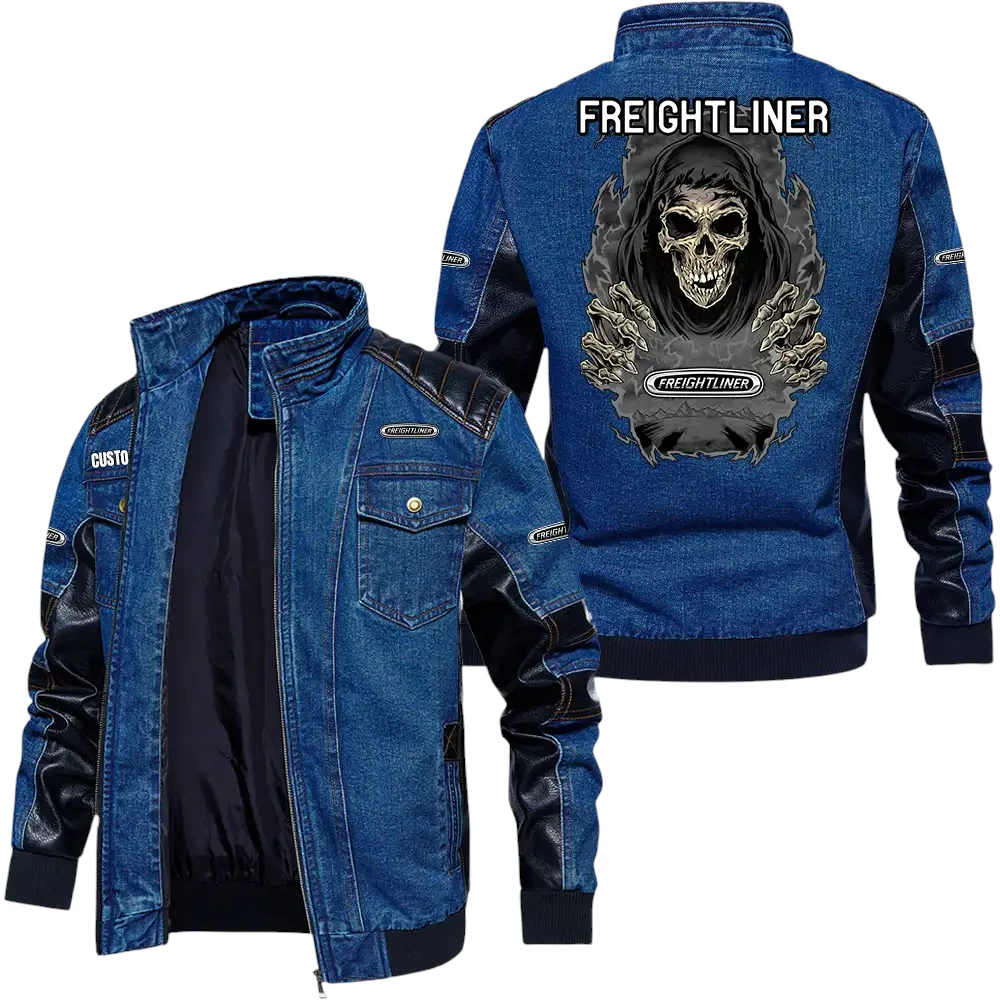 Vintage Freightliner Denim Jacket Sleeve PU Leather, Stand Collar Multi Pockets Custom Name TN150325Y34J91BLCT1FRE