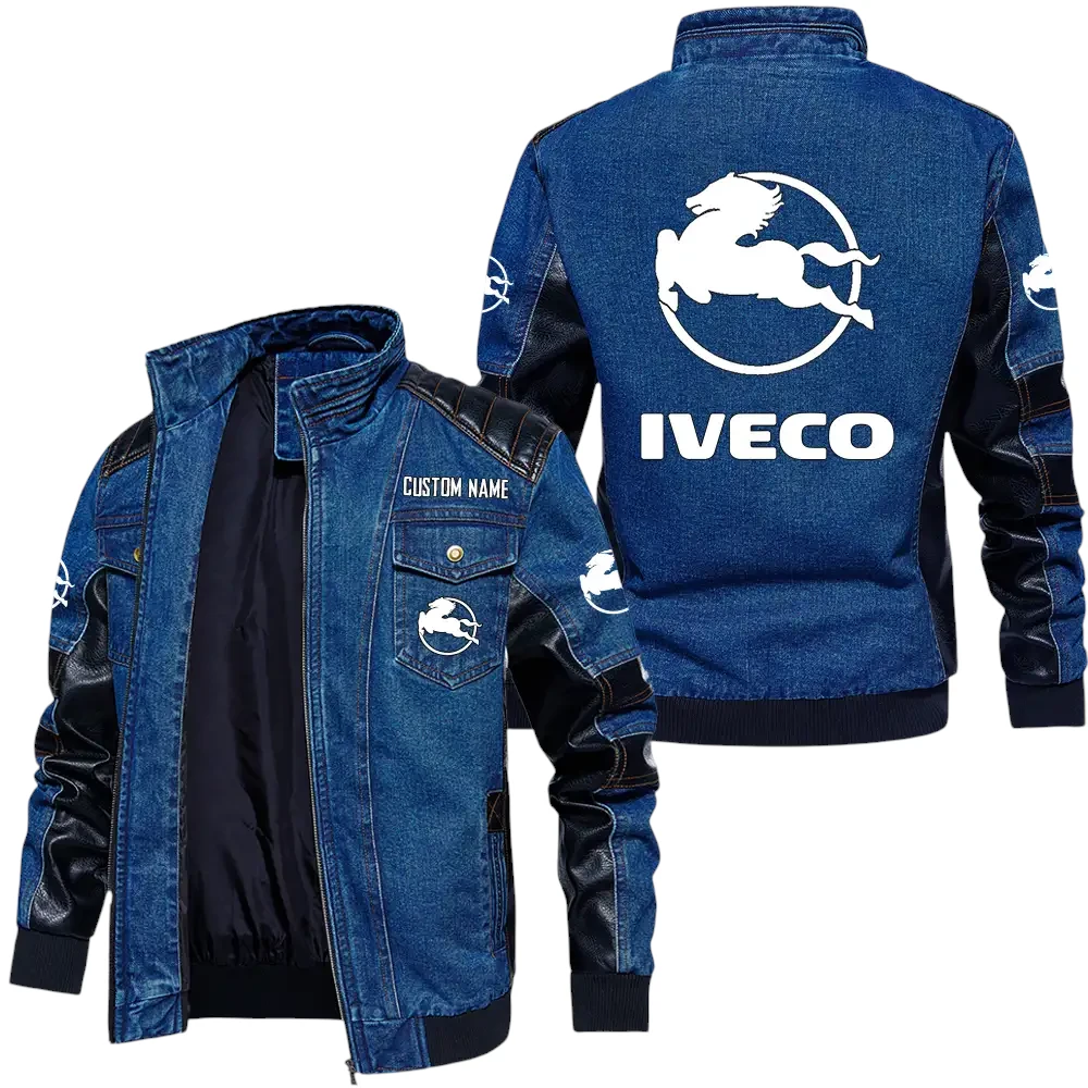 Vintage Iveco Denim Jacket Sleeve PU Leather, Stand Collar Multi Pockets Custom Name TN140325Y34J91BLIVE