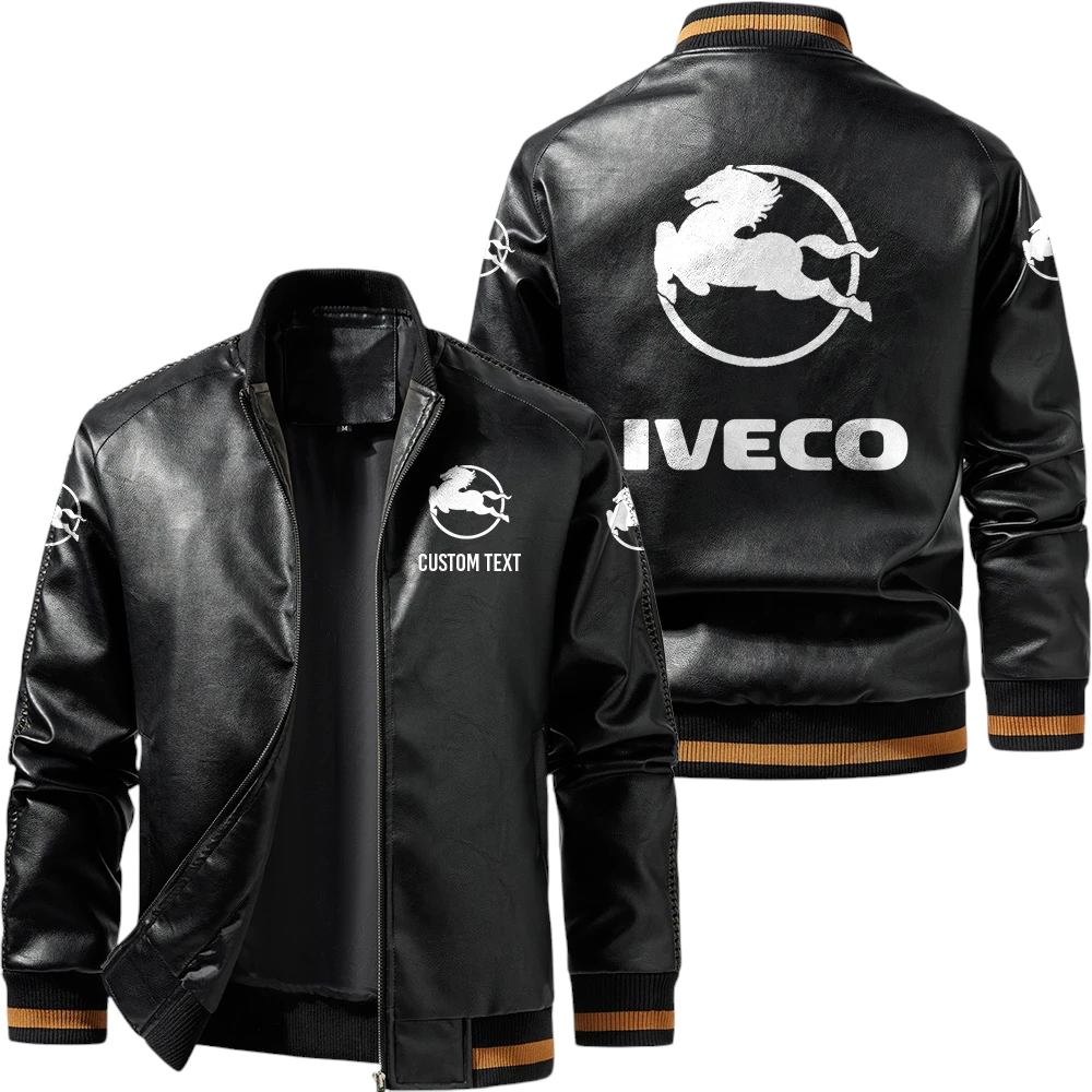 Vintage Iveco Exclusive Logo Leather Jacket, Classic Ribbed Collar Striped Cuffs, Custom Name TN160325Y12LJ93CT1IVE