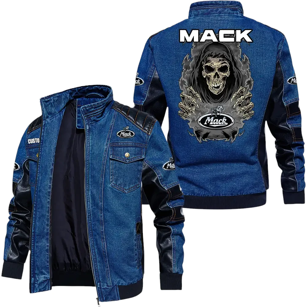 Vintage Mack Trucks Denim Jacket Sleeve PU Leather, Stand Collar Multi Pockets Custom Name TN150325Y34J91BLCT1MAT