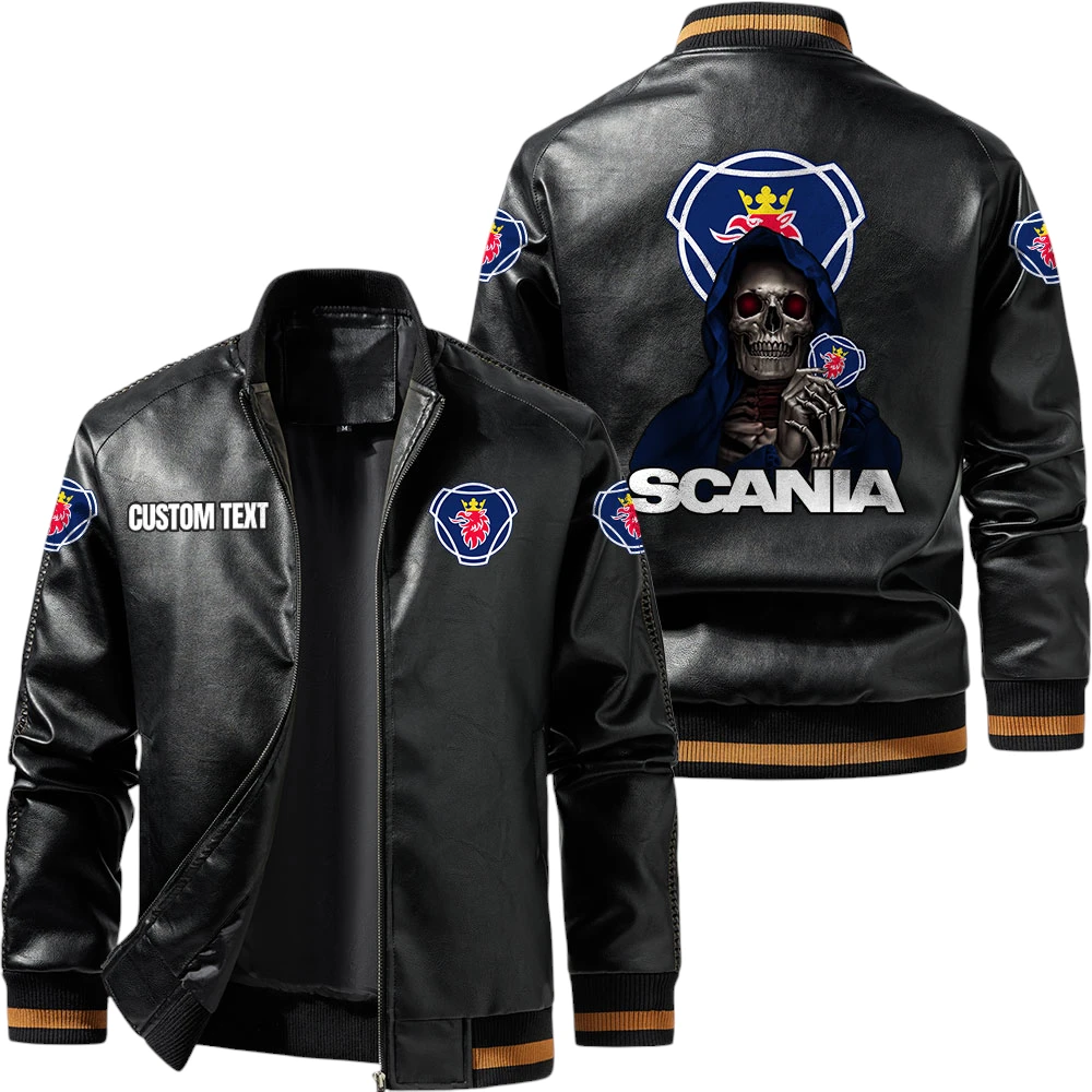 Vintage Scania Exclusive Logo Leather Jacket, Classic Ribbed Collar Striped Cuffs, Custom Name TN160325Y12LJ93CT1SCA