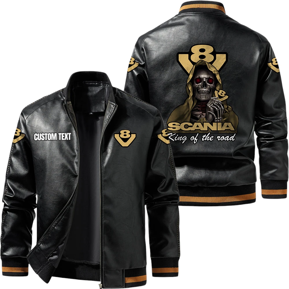 Vintage Scania V8 Exclusive Logo Leather Jacket, Classic Ribbed Collar Striped Cuffs, Custom Name TN160325Y12LJ93CT3SCA