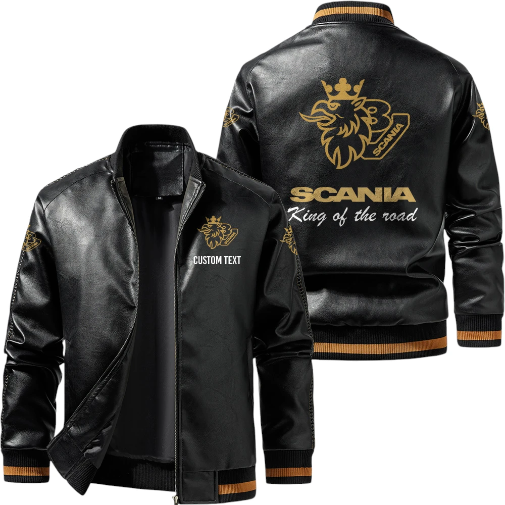 Vintage Scania V8 Exclusive Logo Leather Jacket, Classic Ribbed Collar Striped Cuffs, Custom Name TN160325Y12LJ93CT4SCA